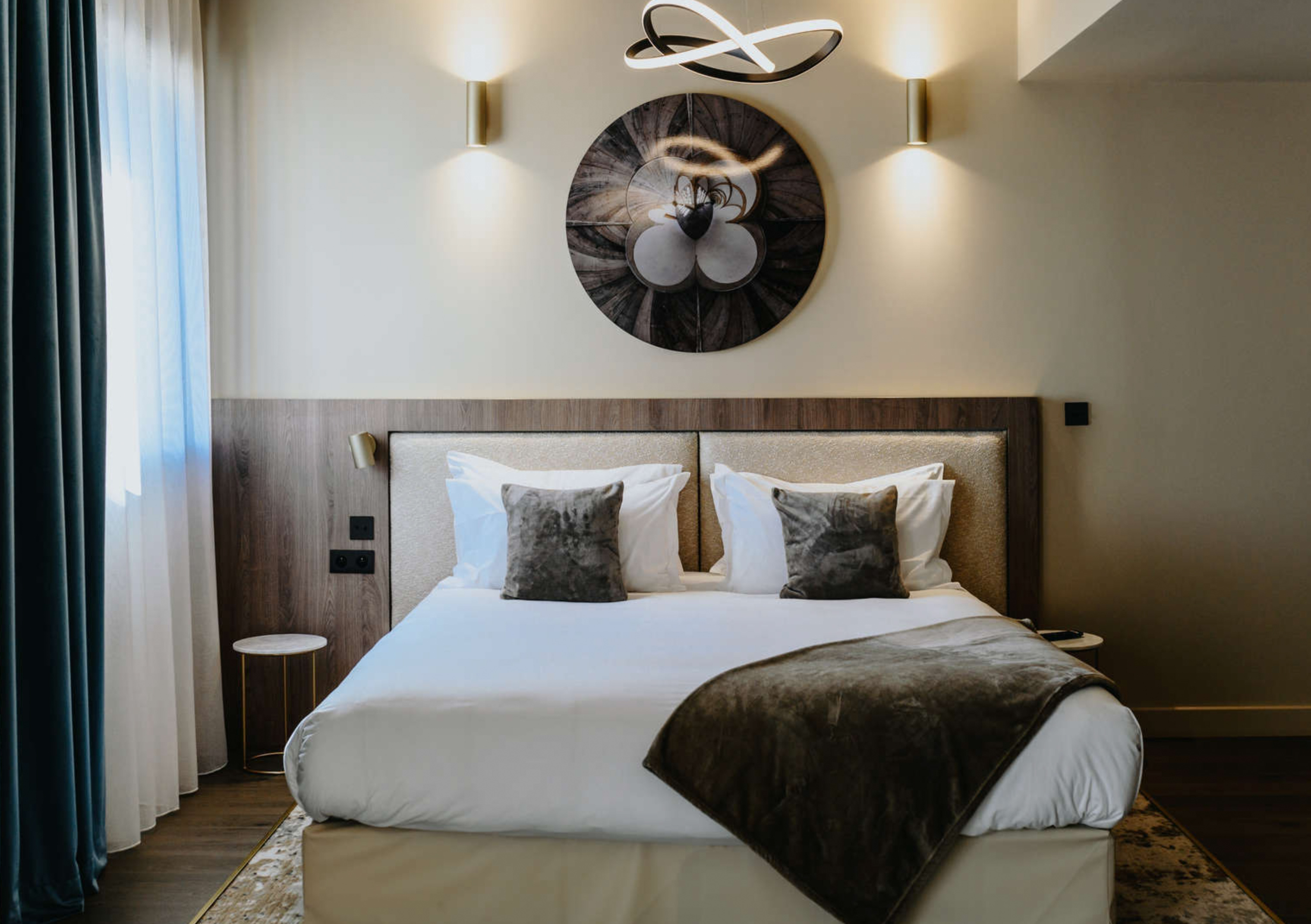 Pour décorer les murs d'un hôtel, nous avons réalisé l'impression et la découpe de 67 tirages photos sur Alu Dibond avec une découpe numérique ronde. Ces impressions photos de qualité sont maintenant accrochées dans toutes les chambres de l'hôtel à l'aide d'un châssis rentrant pour une finition invisible. La forme arrondie de cette décoration murale apporte singularité et douceur aux espaces pour un séjour serein et inoubliable.